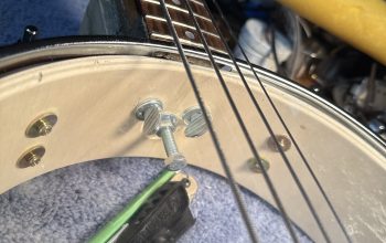 I think the snare I’m using for my banjo bass is not thick enough. The string tension is misshaping it and it won’t play nice figuratively and literally. Maybe bending some laminate flooring I have and gluing it in there to reinforce it or maybe cut a piece of 2×4 and glue it to the ends where the guitar hardware is bolted in (shown in red in the photo) might help. I can hear it creaking and cracking when I go to tune it up plus there’s no tuning stability because the snare drum wood is flexing.