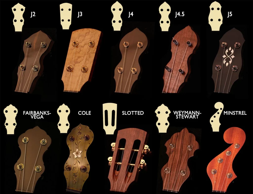 One thing I have been wondering about is the headstock/peghead shape. Maybe a nod to a traditional banjo peghead would be cool. The minstrel headstock would be really cool, eh? But I may go with J5 since the that one has straighter string pulls and the E and D tuners are wider on the peghead than the other 2. Ooh, a reverse minstrel. I do love reversed headstocks!