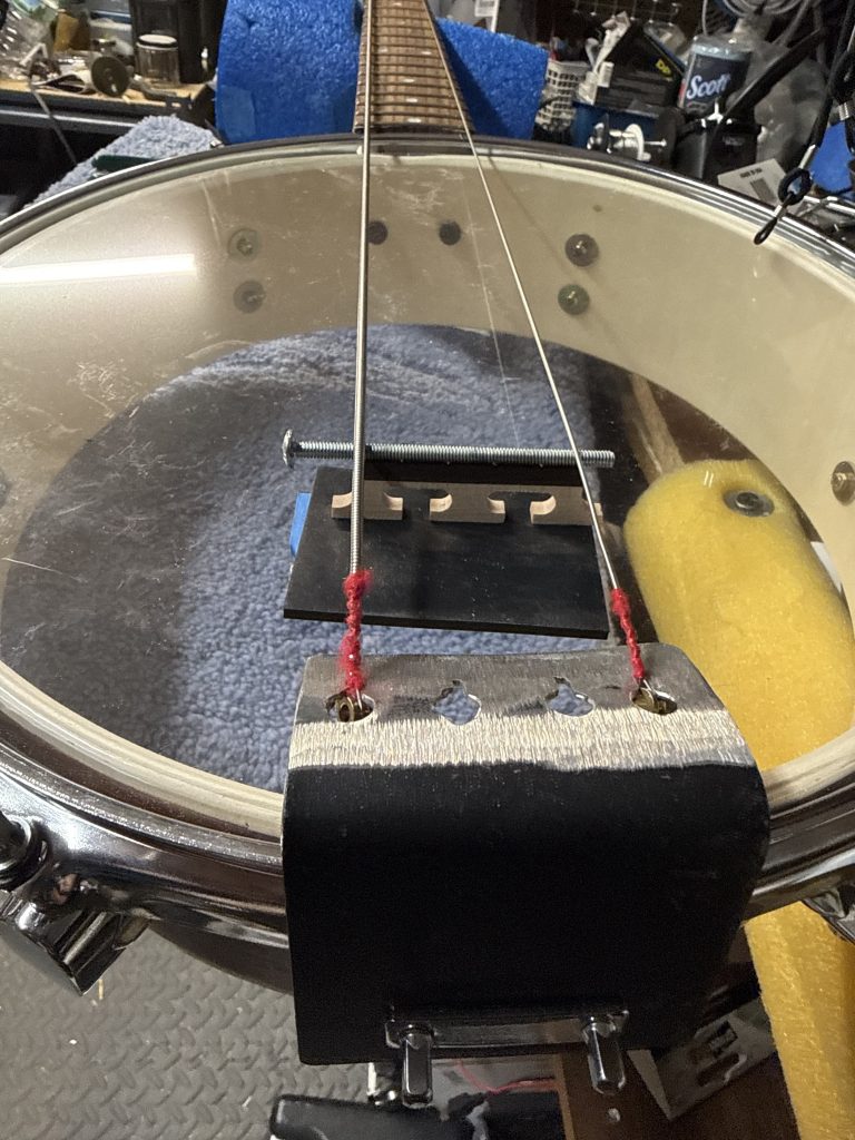 - My acoustic bass guitar tailpiece doesn’t really work, I temporarily mounted it to the side of the snare (or do I call it a pot like a real banjoleer? Wait, is banjoleer their preferred term?) but it was too close to the pot (eh, eh?) rim and I could barely get the strings in the tailpiece when I was stringing it up. I thought it might clamp onto the side of the rim but the bridge is set so far back in the pot away from the neck, there’s not enough room.